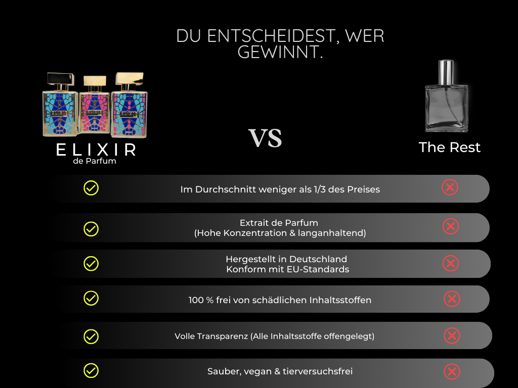 Bei Elixir de Parfum stehen Qualität, Sicherheit und Hautverträglichkeit an oberster Stelle. Alle unsere Parfums erfüllen die strengen Vorgaben der Internationalen Vereinigung der Parfümindustrie (IFRA) und unterliegen den höchsten EU-Kosmetikstandards. Unsere Düfte sind nicht nur bezaubernd, sondern auch umfassend geprüft und zertifiziert, um Dir ein vertrauensvolles Dufterlebnis zu garantieren. Möchtest Du mehr über die Inhaltsstoffe oder Zertifizierungen Deiner Lieblingsdüfte erfahren? Kontaktiere uns einfach unter info@elixirdeparfum.com, und wir stellen Dir alle relevanten Informationen zu unseren Parfums zur Verfügung. Vertraue auf Elixir de Parfum für Düfte, die Luxus, Sicherheit und höchste Qualität vereinen.